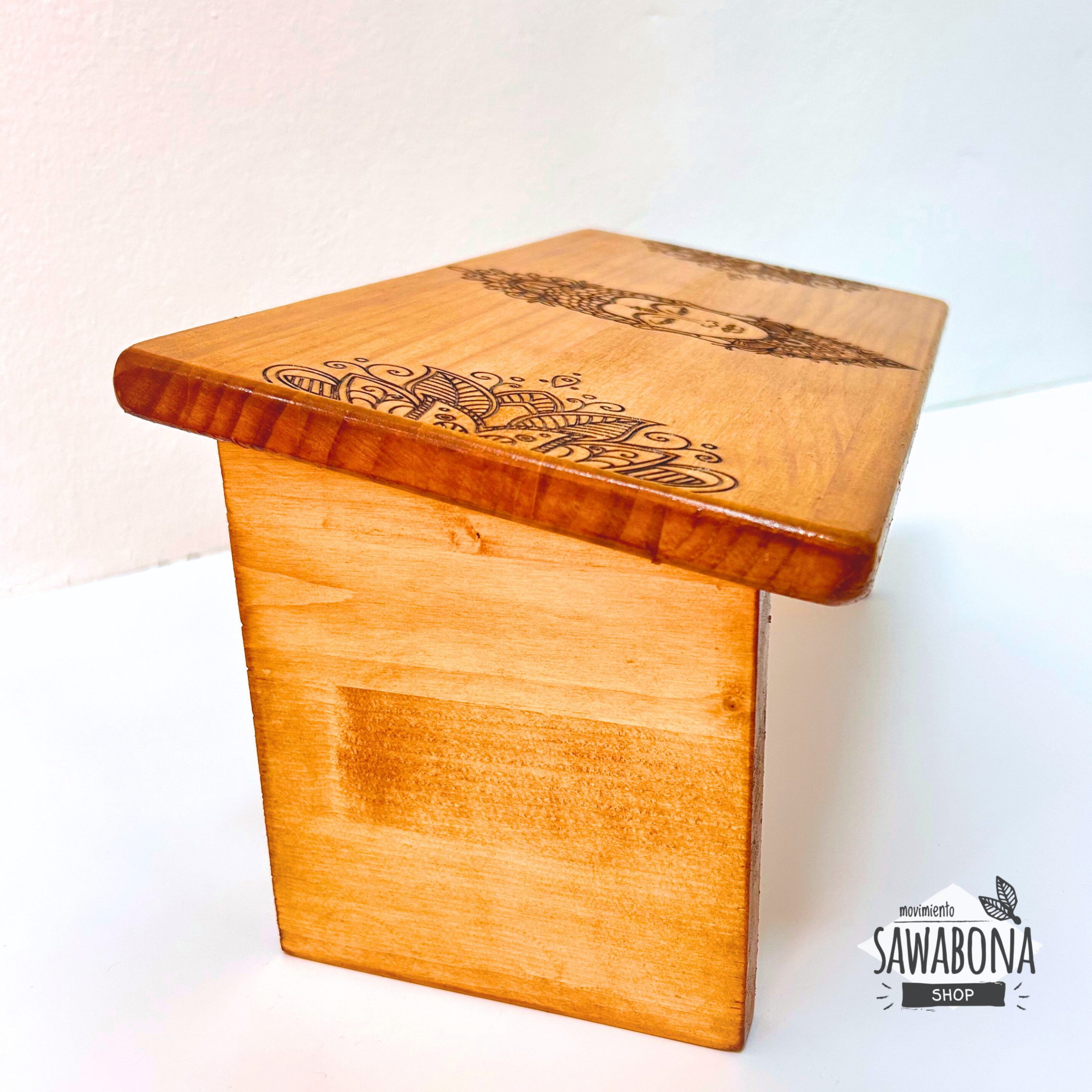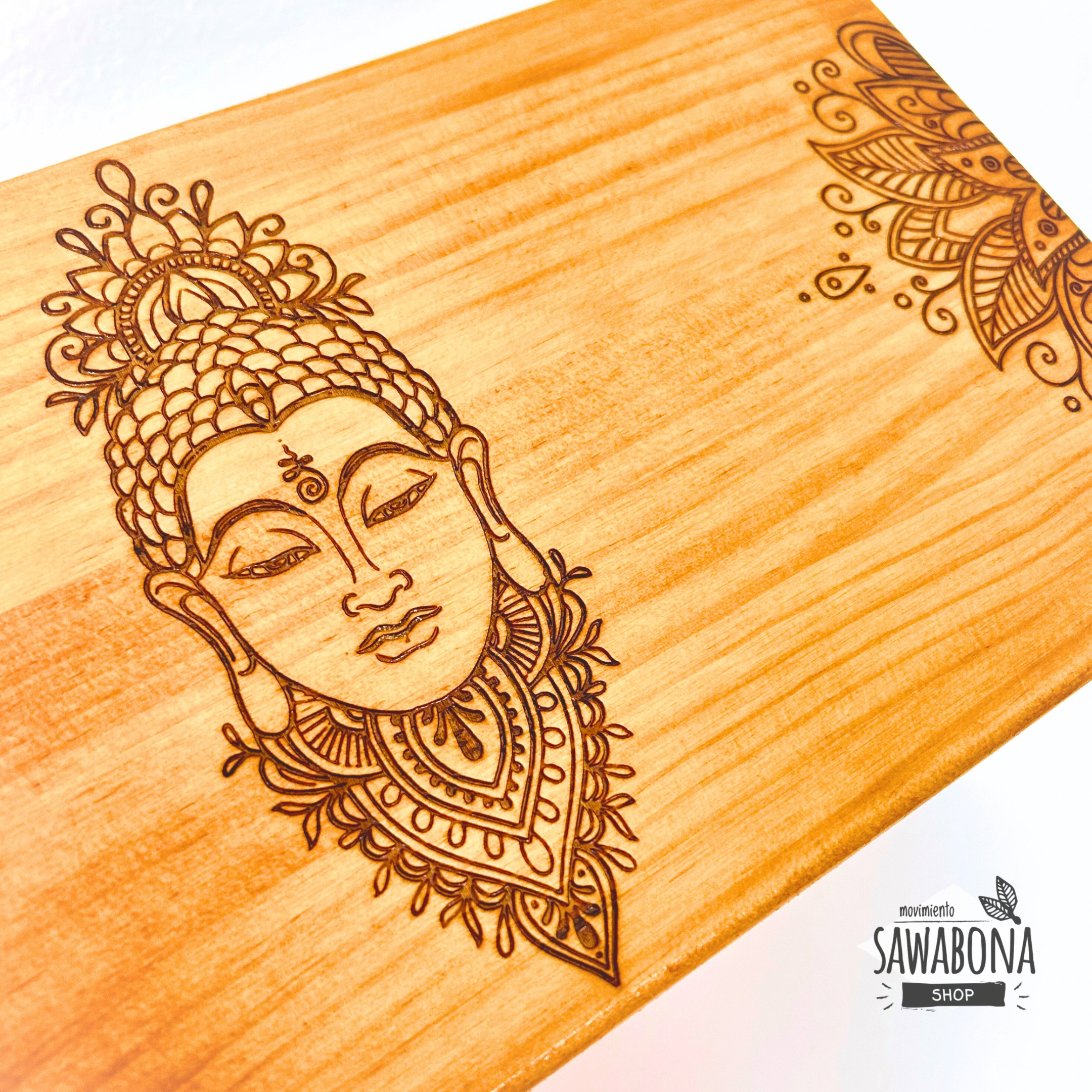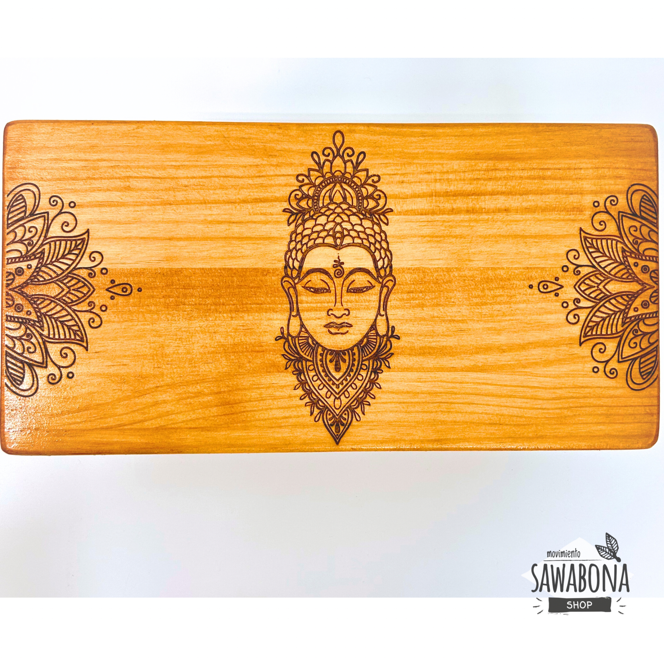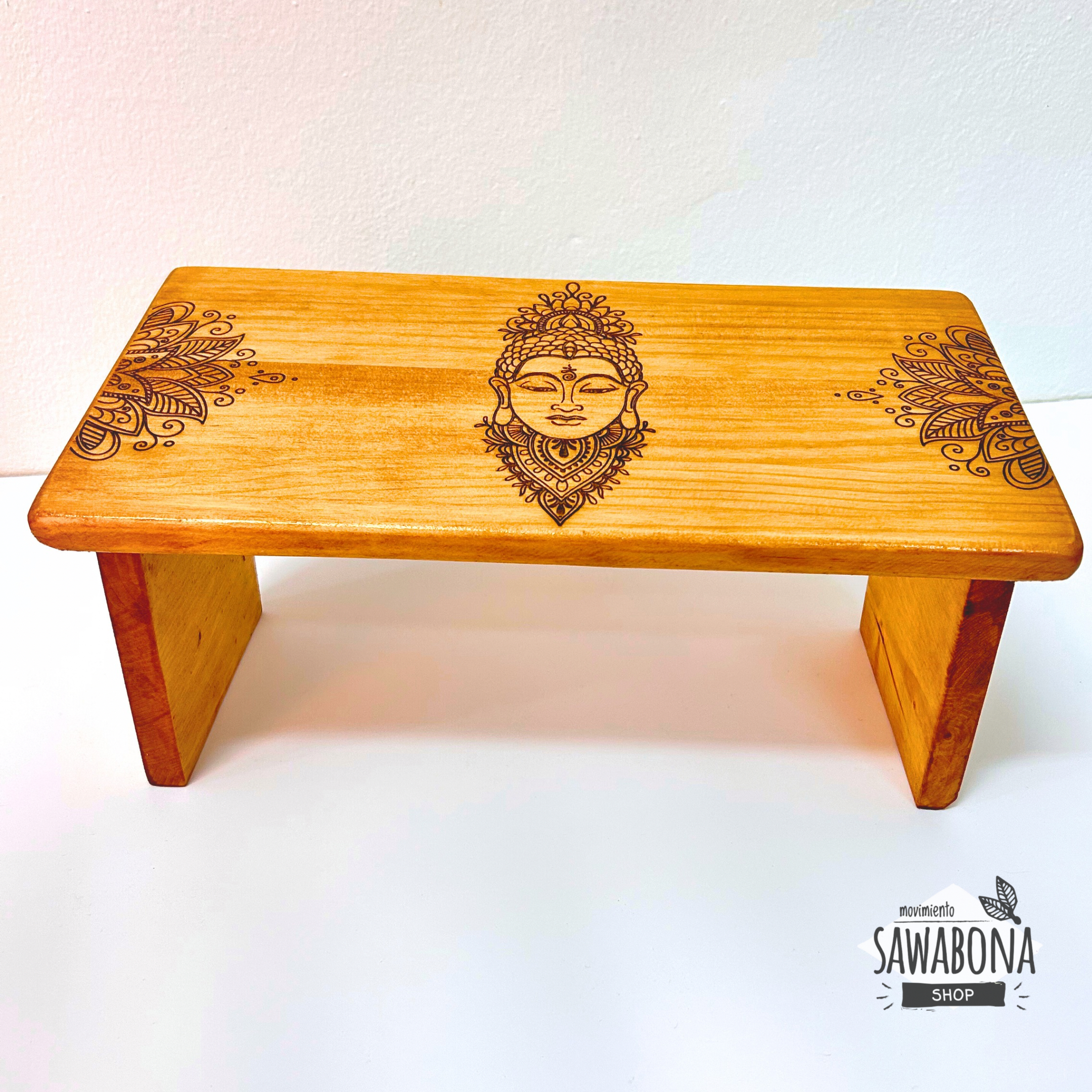 Elaborado en madera natural, este banco de meditación presenta en su superficie la figura grabada de un Buddha en el centro, flanqueado por motivos florales. El diseño transmite serenidad y presencia, recordando la esencia de la práctica meditativa: el silencio y la conexión interior.