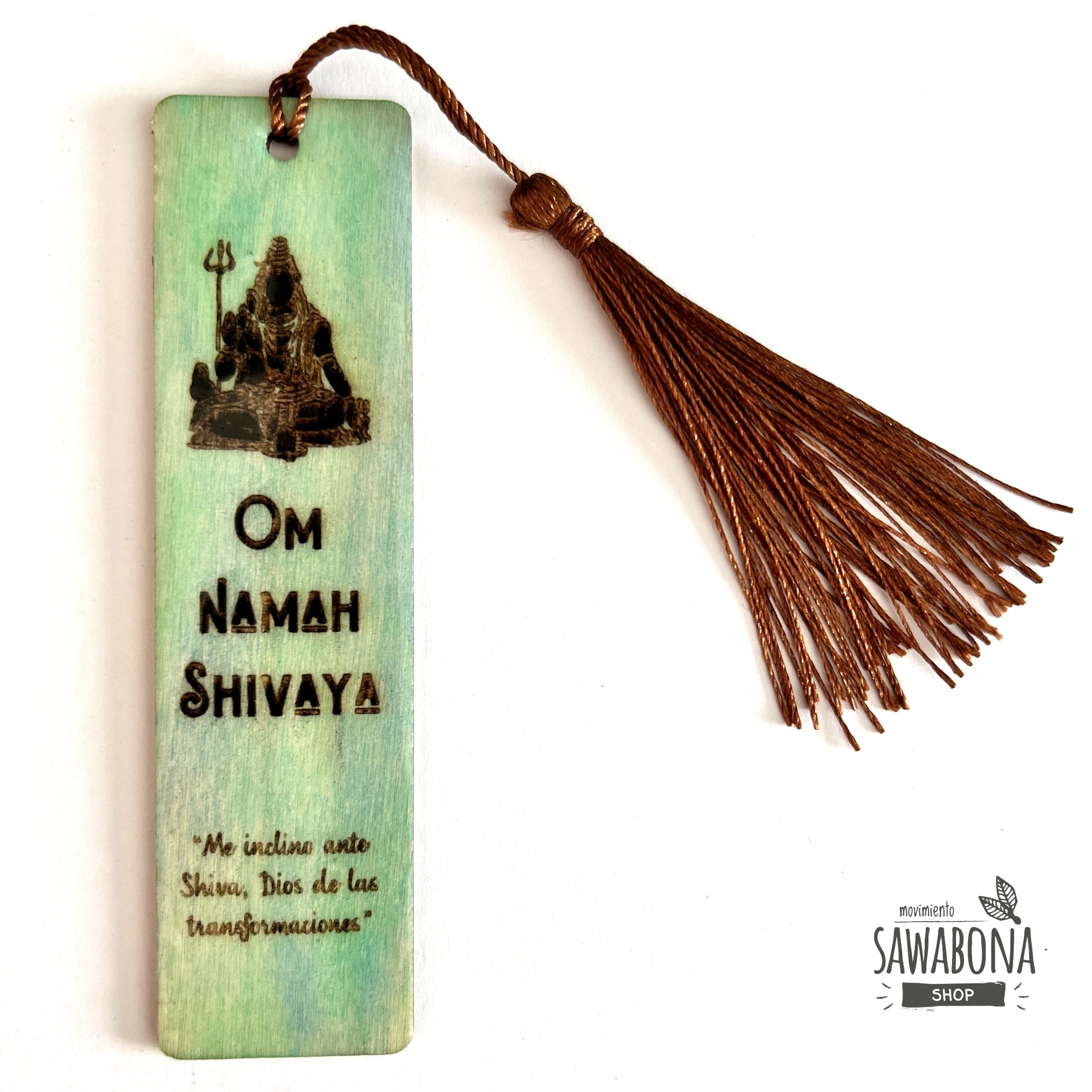 Este marcapáginas de madera, pintado a mano en tonos profundos que evocan la fuerza y el misterio, lleva grabado el mantra sánscrito “Om Namah Shivaya”, invocación a la conciencia pura y a la energía transformadora de Shiva. La pieza incluye la silueta grabada de Shiva, símbolo de destrucción de lo ilusorio y renacimiento espiritual. Un accesorio artesanal que acompaña tus lecturas mientras te conecta con la esencia de lo eterno.
